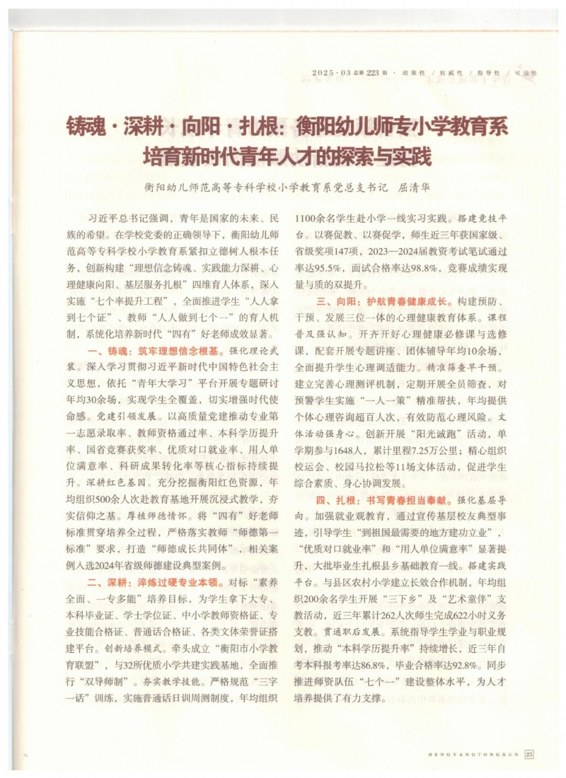 近日,中共衡陽市委主辦刊物《衡陽通訊》2025年第三期(總第223期)以《鑄魂·深耕·向陽·扎根:衡陽幼兒師專小學教育系培育新時代青年人才的探索與實踐》為題,全面報道我校小學教育系創(chuàng)新構建“四維育人”體系,系統(tǒng)化培養(yǎng)新時代“四有”好老師的生動實踐。文章站位高遠、案例翔實,展現(xiàn)了我校在立德樹人根本任務上的扎實探索與顯著成效。