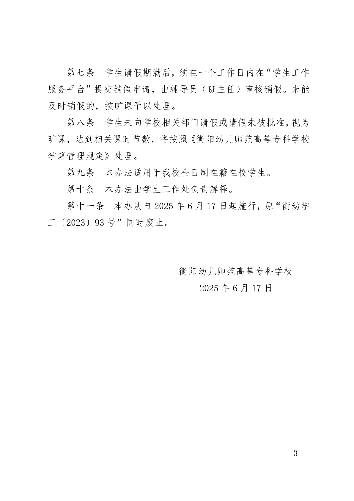 衡陽幼兒師范高等??茖W(xué)校學(xué)生請銷假管理辦法